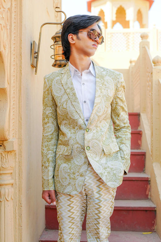 This vibrant green floral suit jacket paired with sleek green striped pants is the perfect...